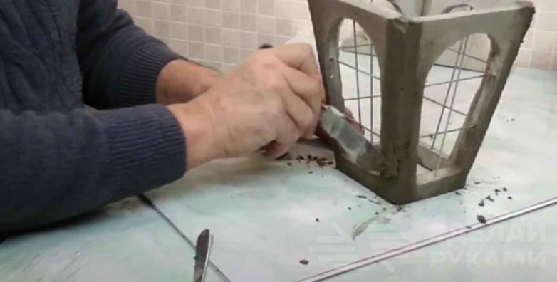 На следующем этапе из цементного раствора изготавливаем боковые части фонаря. По центру и по краям устанавливаем металлическую проволоку.