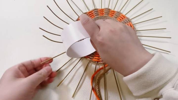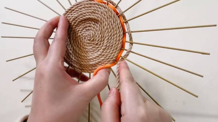Начните закрывать дно. Приклейте джутовый шпагат или любую толстую пряжу по кругу. Слегка зайдите на деревянные шпажки и начните поочерёдно переплетать. Одна пряжа будет переплетаться поверх другой.