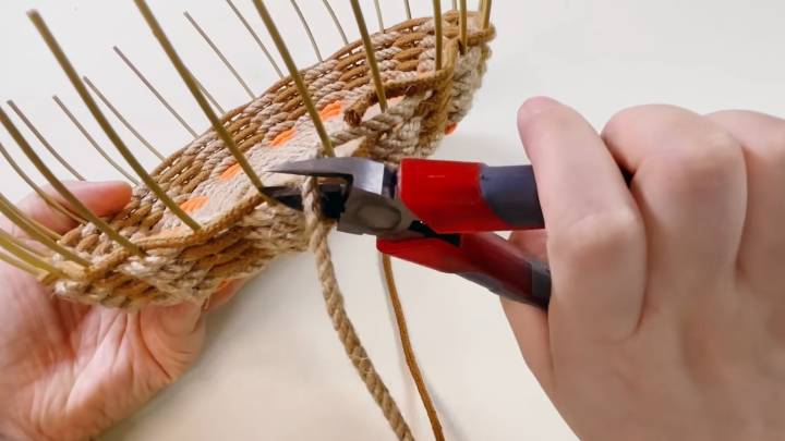 Теперь начните переплетать по две пряжи сразу. Плетите одну поверх другой около 3 рядов. Затем шпагат/пряжу обрежьте.