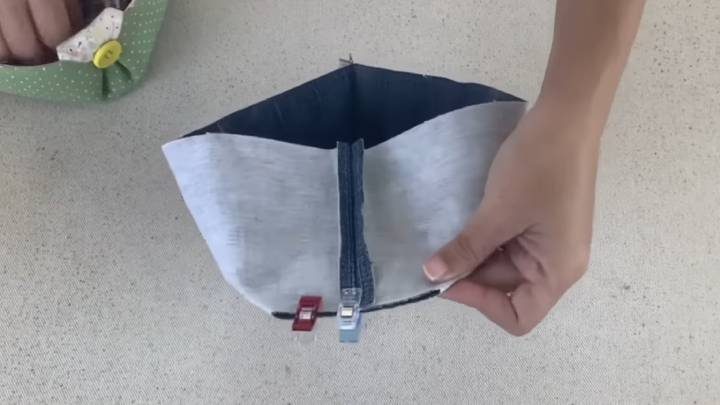 Вставьте джинсовый мешочек в тканевый. Совместите края, сколите булавками. Сшейте на машинке по верхнему краю, отступая 1 см. Оставьте окошко для выворачивания.