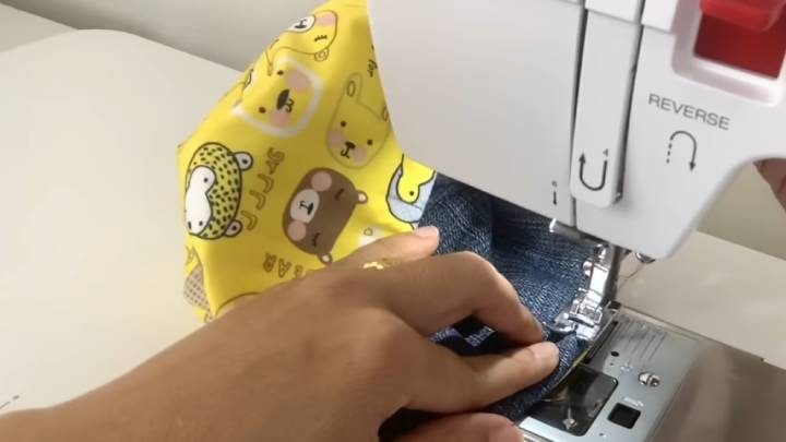 Сложите готовую джинсовую и тканевую деталь пополам по длине. Прошейте по боковым сторонам, как показано на фото ниже.