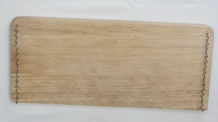 Чтобы сплести небольшое изделие, возьмите любую деревянную основу. В качестве примера может выступать разделочная доска. По боковым сторонам друг напротив друга забейте гвозди на расстоянии 1 см друг от друга.Уточнение