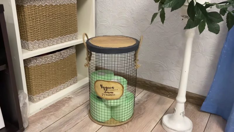 Для окрашивания основания корзины и сетки используйте черную аэрозольную краску. Чтобы место соединения сетки с дном выглядело более аккуратно, задекорируйте его с помощью джутового каната.