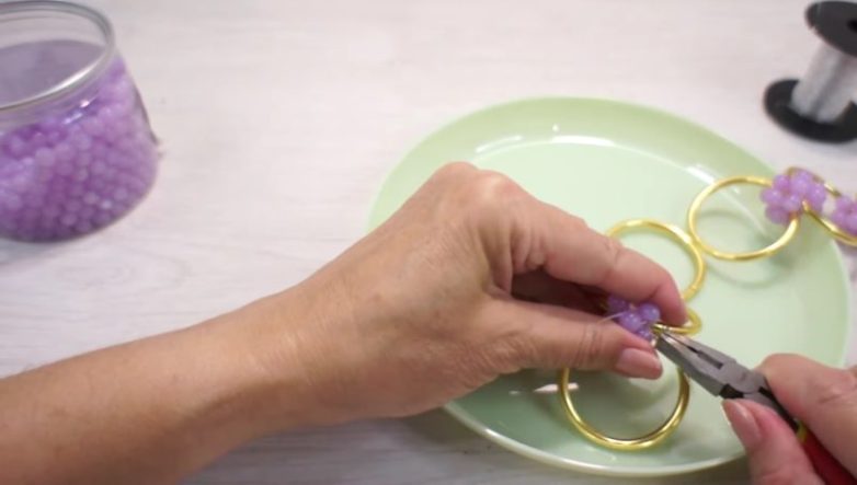Liliya DIY — Art Stories/youtubeРазместите бусины на всех стыках колец. Скрепите три цепочки бусин между собой и замкните заготовку в кольцо.