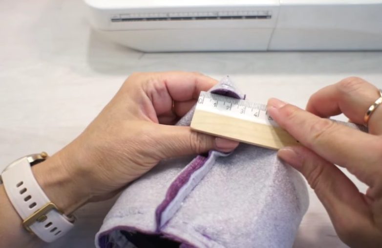 Проложите фиксирующие строчки по боковым срезам сумочки. Для придания сумочке объема разложите уголки плоско и проложите строчки на расстоянии 3 см от уголков. Срежьте уголки, оставляя припуски по 5 мм.