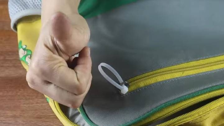 Поломался бегунок на молнии? Проблему можно решить подручными средствами, если в доме есть пластиковые хомуты. Просто закрепите стяжку и обрежьте. Получился временный, но полностью рабочий бегунок.