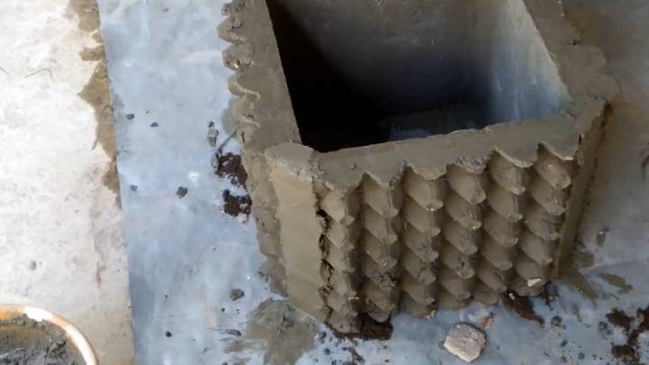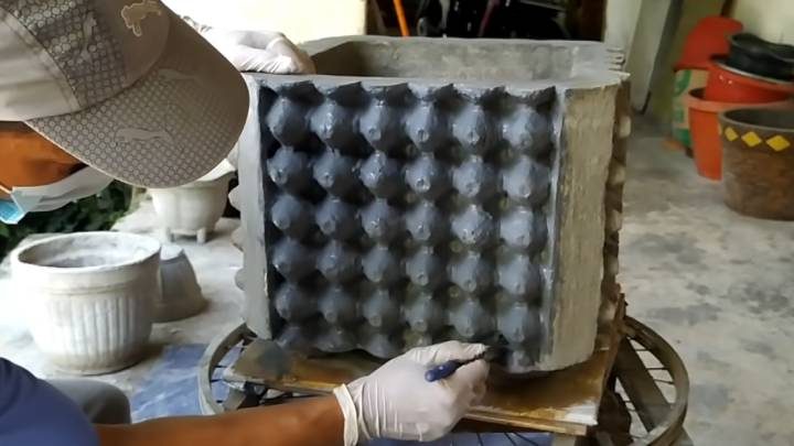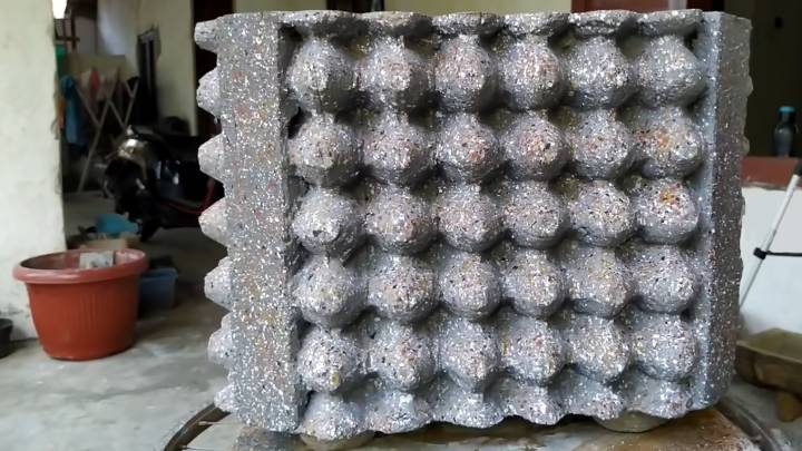 Поставьте формы из яичных лотков. Соберите короб. Скрепите сверху и снизу проволокой. Разведите цемент с песком 1:1 водой до более густого раствора. Смажьте сначала углы внутри, затем — снаружи.