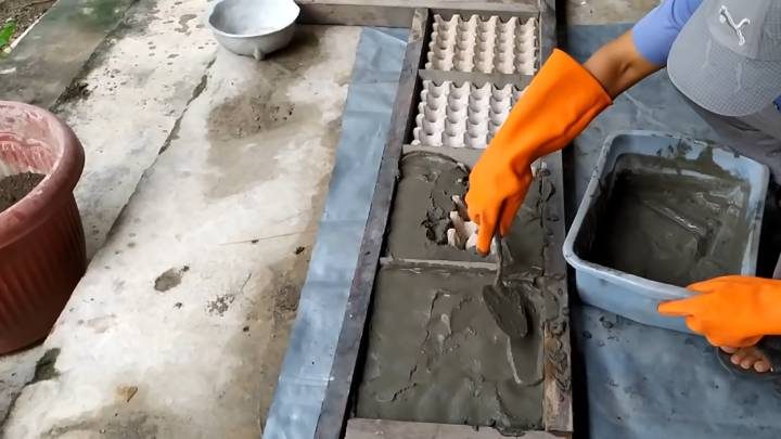 Сложите упаковки из-под яиц в ряд. Для выравнивания подложите доски. Разведите цемент с песком 1:3. Залейте водой до получения раствора средней густоты. Заполните картонные ячейки.