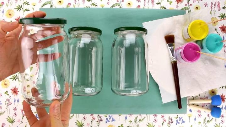 Отдельно покрасьте крышки в такой же цвет, что и банки. Когда они просохнут, возьмите белую краску, деревянные шпажки и ватные палочки. Сделайте красивый узор!
