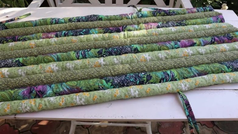 Каждую полосу наполните синтепоном. Для удобства работы используйте палку, которая поможет протолкнуть наполнитель в нижнюю часть сидушки.