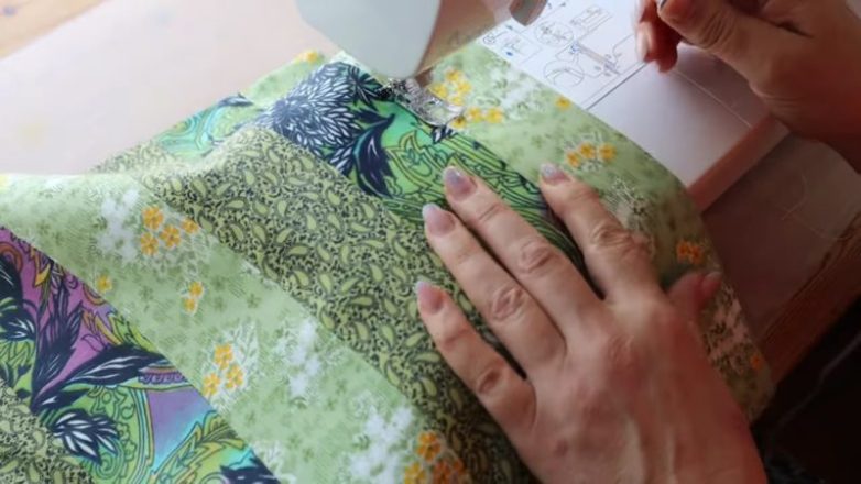 Для пошива сидушки понадобятся полосы разноцветных тканей шириной ориентировочно по 8 см с учетом 1 см припуска на швы. Ширина полос рассчитываются в зависимости от ширины сидушки. Сострачивайте полосы ткани между собой в произвольном порядке.