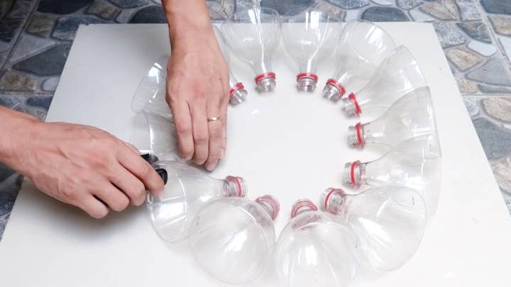 Соберите 13 горлышек в круг. Скрепляйте их между собой обычным степлером для бумаги.
