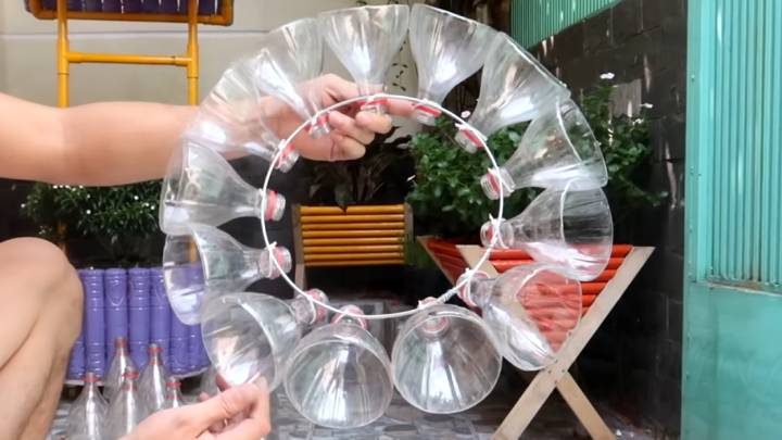 Из толстой проволоки скрутите кольцо. Концы зафиксируйте проволокой потоньше. Присоедините кольцо из проволоки к горлышкам бутылки. Используйте для этого хомуты (кабельные стяжки).