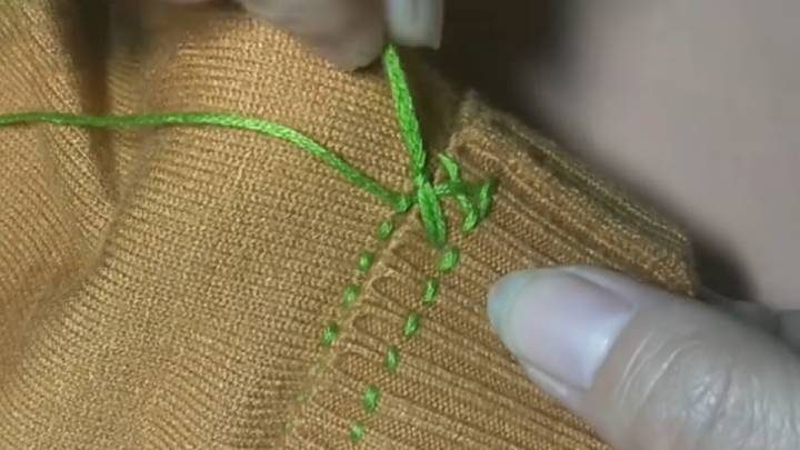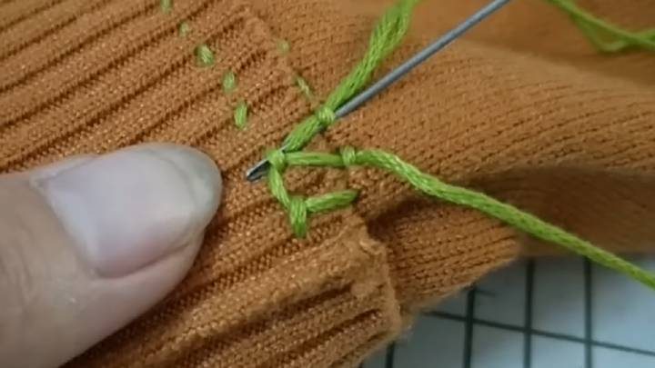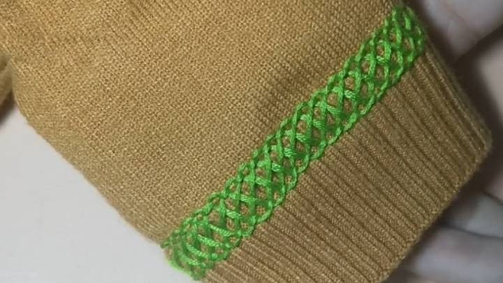 Для второй идеи точно так же подготовьте нитки мулине и штопальную иглу. Загните рукав вверх. Проложите первую строчку швом «вперёд иголка», отступив от края 1 см. Затем перейдите на сам рукав. Вторую строчку таким же швом проложите не параллельно, а в шахматном порядке.Разверните иглу, введите её тупым концом в нижний правый стежок, затем — в следующий стежок в ряду слева. Выведите наверх, под центральный стежок. Перейдите к следующему стежку сверху слева. Вставьте иглу вновь во второй стежок снизу (по диагонали), перейдите к следующему нижнему.