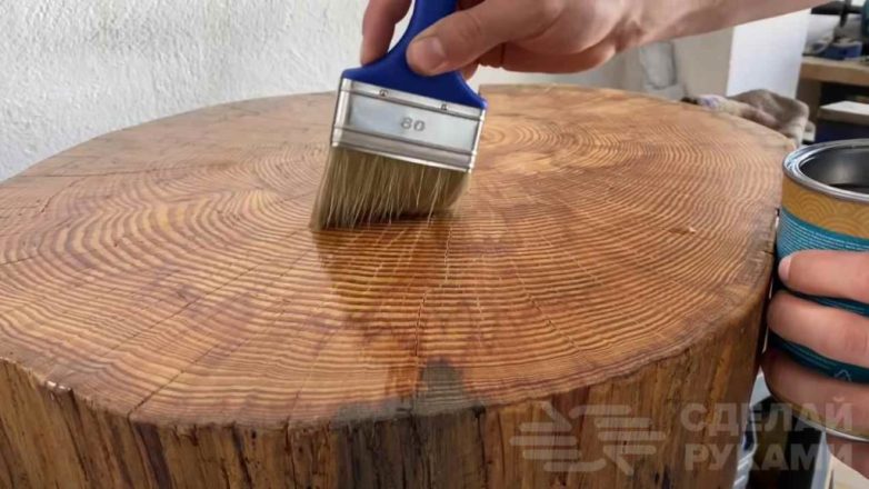 Первым делом нам потребуется спил дерева, который будет выступать в качестве столешницы. Для этого берем подходящий по диаметру пень, делаем разметку, и отпиливаем нужную часть бензопилой.