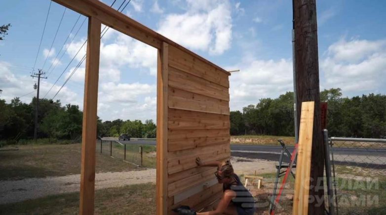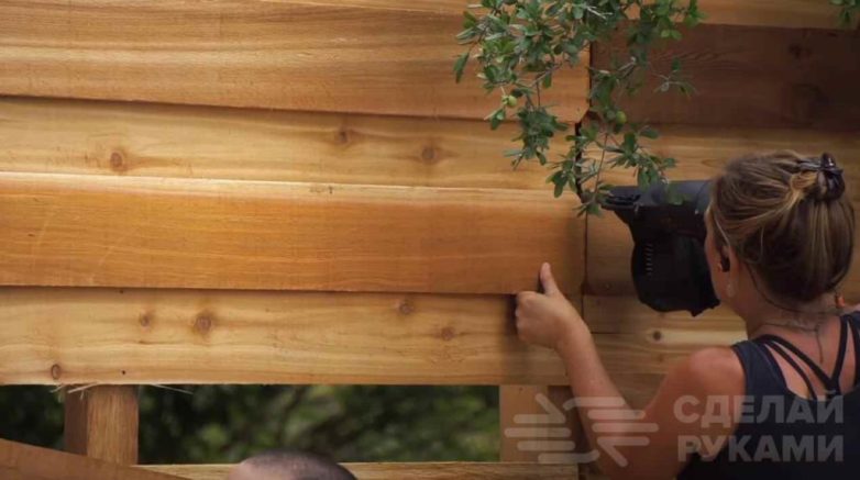 Сначала подготавливаем доски. Прибиваем к столбам и стойкам первый «слой» досок. Оставляем между ними зазор чуть меньше ширины доски.