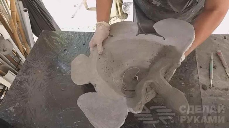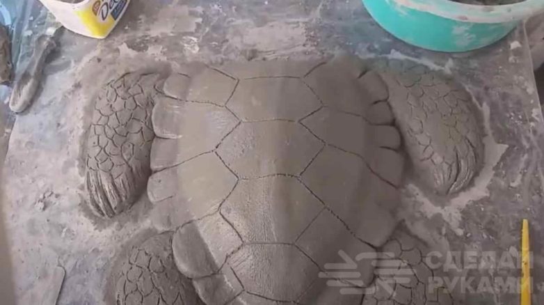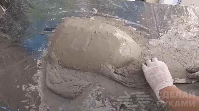 Первым делом необходимо сделать форму панциря из песка. Потом замешиваем цементный раствор. Поливаем форму сверху, разравниваем шпателем.