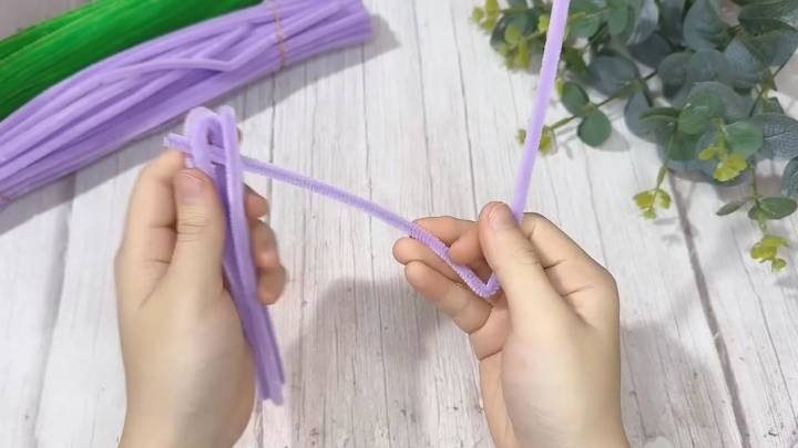 Схожим образом сделайте большой цветок. Для этого возьмите 4 синельные проволоки, согните пополам. Одной из них скрепите остальные три: закрутите и опустите вниз.