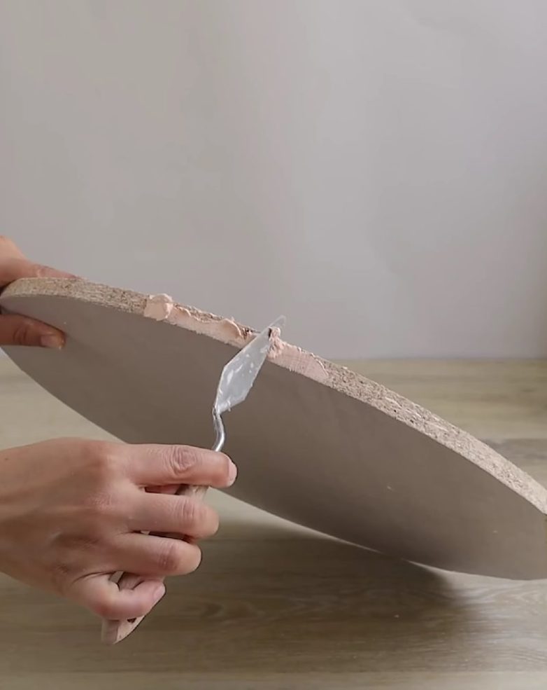 Из имеющегося материала (фанера, отрез дерева, МДФ и пр.) вырежьте круглую столешницу для столика. Края столешницы выровняйте с помощью шпаклевки и наждачной бумаги.
