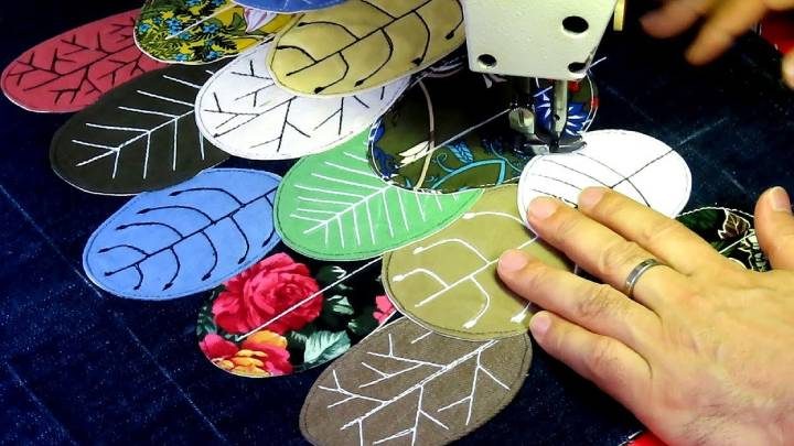 Прошейте на машинке в технике свободно-ходовой стёжки подходящей лапкой. Используйте контрастную нить, чтобы прожилки листьев были видны!