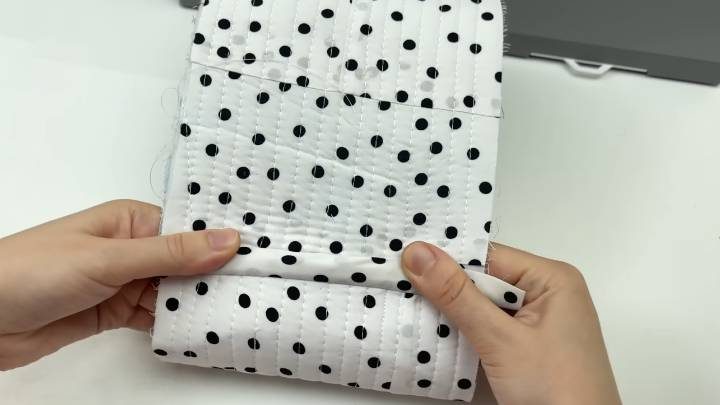 Проложите строчку на машинке, одновременно пришивая к ватину. Лишнюю ткань по бокам обрежьте. Добавьте ткань для обратной стороны.