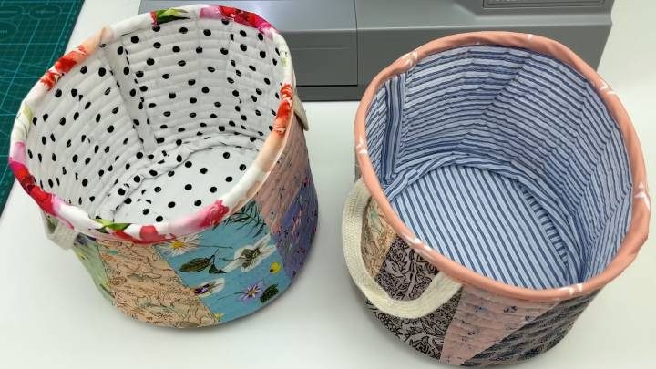 Совместите дно и стенки. Прошейте. Добавьте ленту (косую бейку), чтобы обработать край. Выверните на лицевую сторону. Бейкой также обработайте верхний край. По желанию пришейте ручки. Получились милые текстильные корзинки, которые шьются на раз-два!