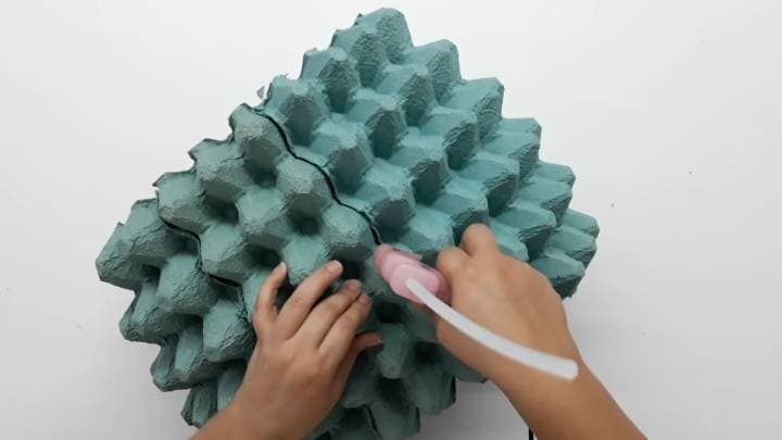 Подготовьте 5 самых больших картонных упаковок для яиц — каждая вмещает 30 шт. Этого количества достаточно для создания одной поделки! Расположите картонные лотки на рабочей поверхности. Склейте одну с другой, используя клеевой термопистолет.Сверните заготовку из лотков в кольцо. Склейте края горячим клеем.