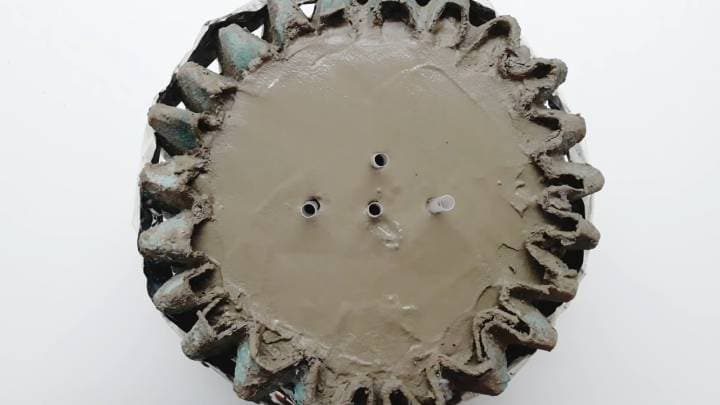 Сверху и в отверстия между картоном и лотками залейте раствор. Для него смешайте 1 часть цемента, 2 части песка и воду до получения необходимой густоты. Тонкий шланг нарежьте на кусочки, установите в центр. Оставьте высыхать на сутки-двое, в зависимости от температуры и влажности воздуха в помещении.