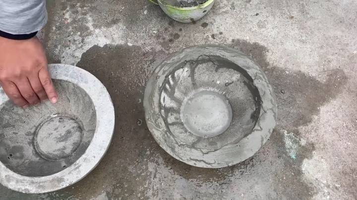 Разведите цемент с песком 1:2, залейте водой до необходимой густоты. Подберите несколько одинаковых круглых форм. Смажьте маслом и/или выстелите пакетом внутри. Залейте раствор. Дополнительно добавьте арматуру. Внутрь погрузите тарелку, наполните камнями. Оставьте на сутки.