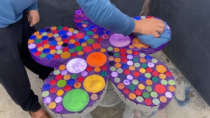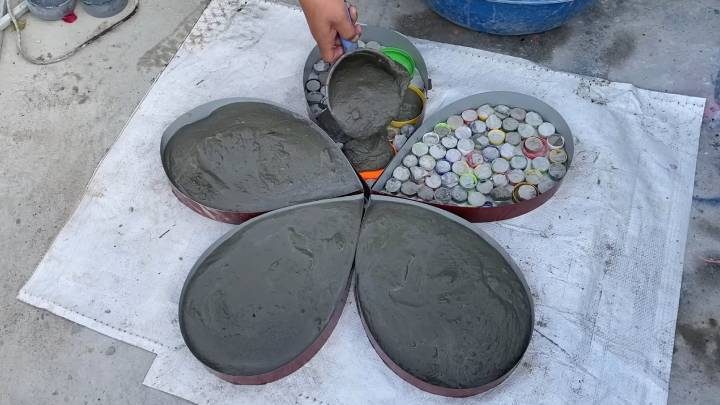 Подберите достаточное количество пластиковых крышек. Рабочую поверхность застелите плёнкой или любым другим подходящим материалом. Сделайте форму лепестков. Заполните крышками. Залейте песчано-цементным раствором. Добавьте арматуру.