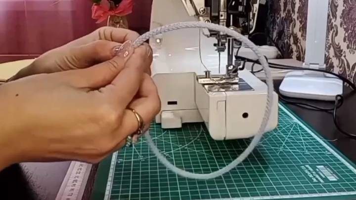 Теперь возьмите шнур другого цвета. Отмерьте 47 см, закрепите на машинке в кольцо.