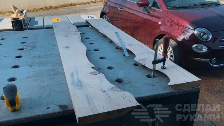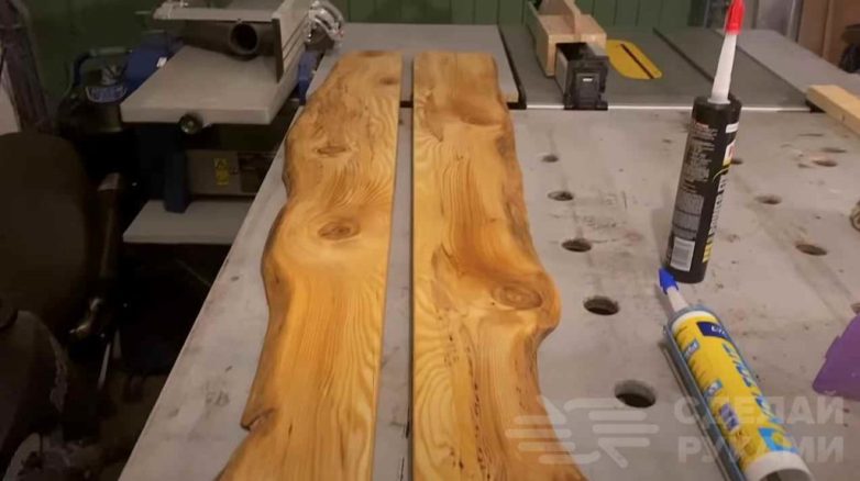 Первым делом необходимо обрезать края доски на торцовочной пиле или ручной циркуляркой с направляющей. Затем распиливаем доску на две части вдоль.