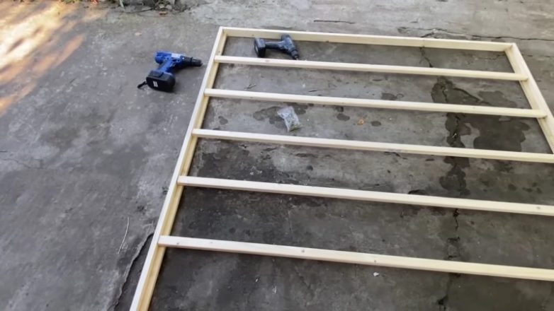 Второй этап — установка креплений для поперечных реек. Для этого к боковым сторонам рамки по внутренней стороне прикрепите брус 20 мм х 20 мм.