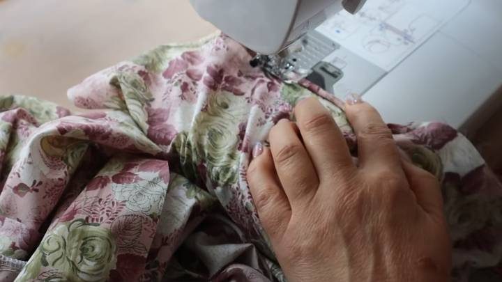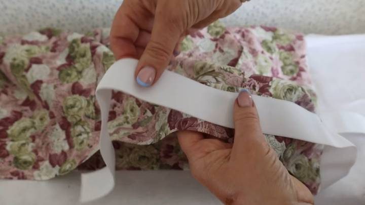 Сделайте соединительный шов. Оставьте небольшое отверстие не зашитым, чтобы вставить резинку. Пристрочите пояс, отступите сверху 1,5 см для сборки. Зашейте резинку и отверстие.