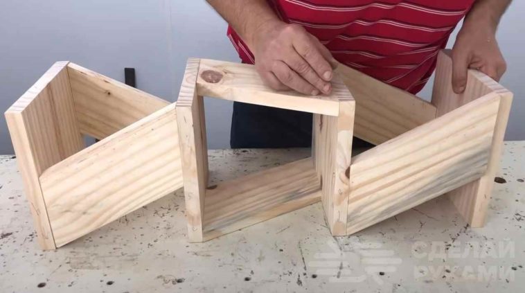Первым делом необходимо будет отпилить заготовки нужного размера. В качестве исходного материала используем доски.Для изготовления полок выпиливаем квадратные заготовки. Сами стенки будут прямоугольной формы, с обрезанными под углом краями.