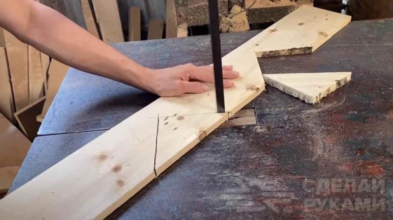 Первым делом берем две подготовленные доски. Делаем разметку и выпиливаем на ленточной пиле (или лобзиком) треугольные пазы.