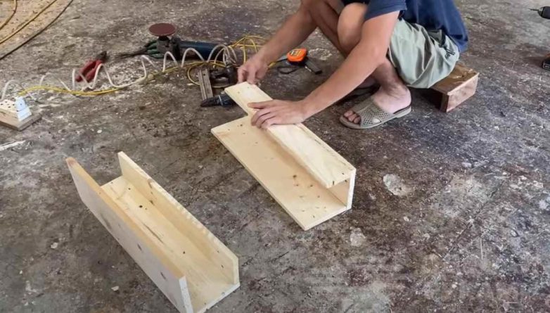 Далее нам потребуются еще пара досок, которые будут выступать в роли стоек. Крепим к ним под углом две опорные доски с пазами.