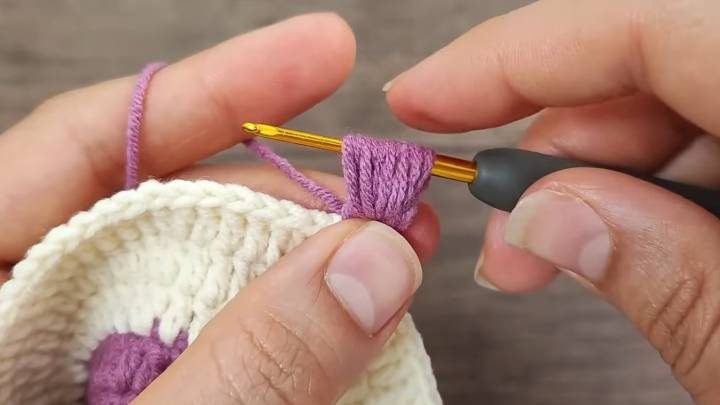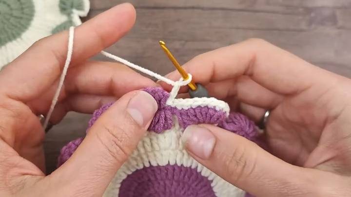 В конце готовые лепестки можно обвязать простыми столбиками без накида. Чтобы было ещё красивее, поменяйте нить.