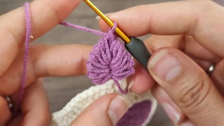 В эту же петлю, где закрепились, провяжите 3 ВП и 1 ССН — основание лепестка. Полностью повторите паттерн вязания выше. И так — до конца ряда.