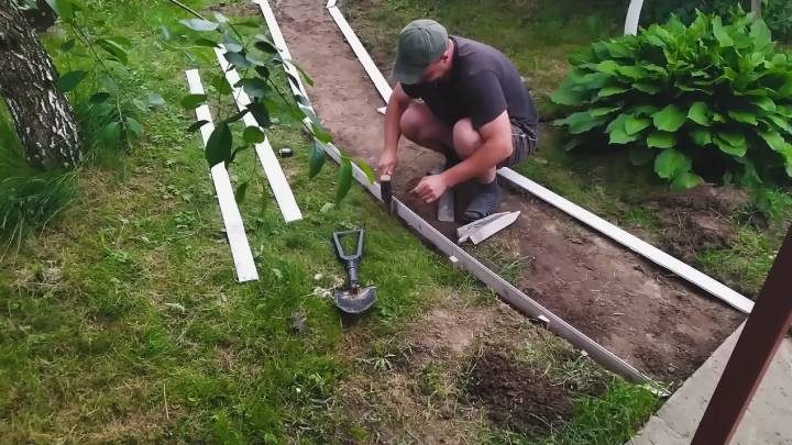 Наметьте, где будет располагаться будущая садовая дорожка. Снимите около 3—5 см дерна. Поставьте опалубку. Можно использовать любой имеющийся в наличии материал. В данном МК мастер использовал старые пластиковые панели.