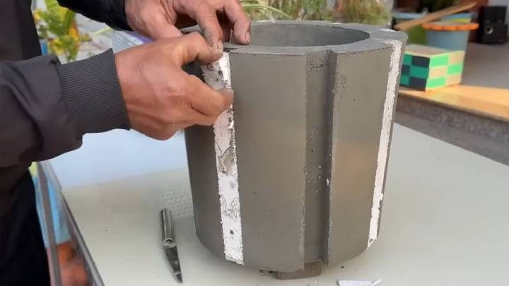 Достаньте цементную заготовку из ведра. Сделать это проще всего следующим образом: переверните его дном вверх и полейте горячей водой. Тогда ведро с лёгкостью снимется! Удалите песок из дна и середины поделки, уберите цилиндр и весь пенопласт.