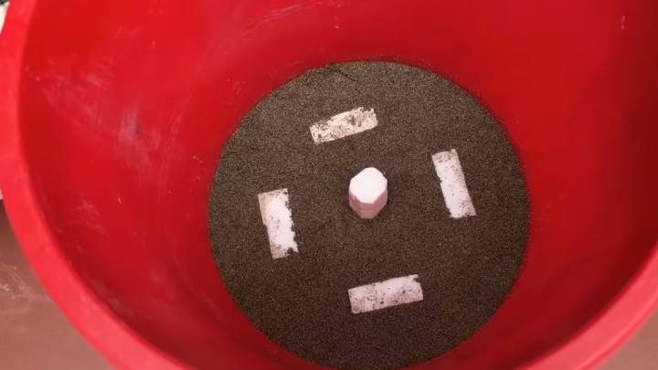 На дно пластикового ведра положите 4 маленьких прямоугольника. Сверху насыпьте 3 см влажного песка, чтобы он был вровень с пенопластом. Затем вырежьте одну круглую вытянутую деталь, установите её по центру (см. фото ниже).