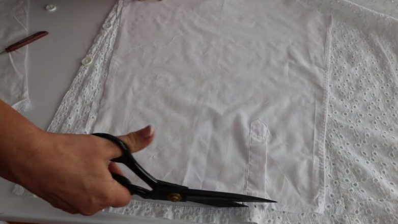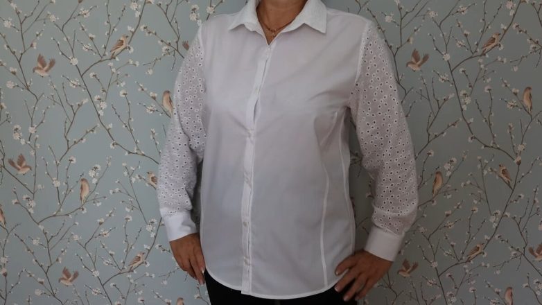 Если в вашем гардеробе есть скучная классическая рубашка, ее легко можно превратить в новую более красивую и женственную вещь с помощью нескольких кусочков ткани прошва. Работа по переделке рубашки очень простая, даже начинающая швея справится без проблем.