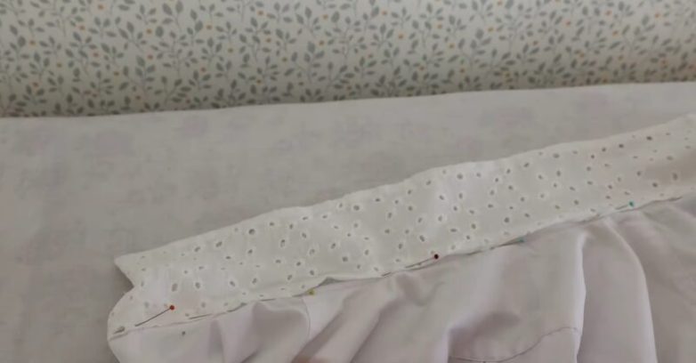 Так как планка была двойной, одна часть останется прежней. Ко второй части планки пристрочите полосу белой ткани шириной 5 см.