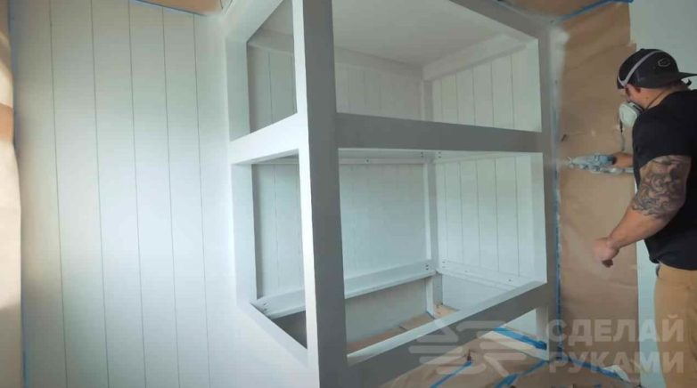 Прикручиваем опорные рейки к внутренней стороне бортов (царг) кровати. После этого все шлифуем и приступаем к покраске каркаса. В данном случае автор выбрал белую краску.