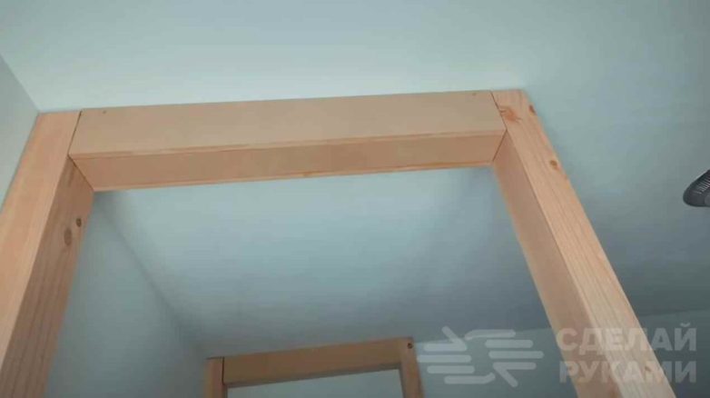 В верхней части каркаса (под потолком) автор также прикручивает к стойкам доски. Но чтобы все было эстетично, эти доски автор решил закрыть коробами из МДФ. Потом можно установить багеты или декоративный штапик.