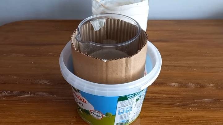 Дно пластикового ведра смажьте маслом. Картон сверните, склейте скотчем. Установите по центру в ведро. Разведите гипсовую штукатурку водой до жидкой консистенции. Влейте внутрь картона.