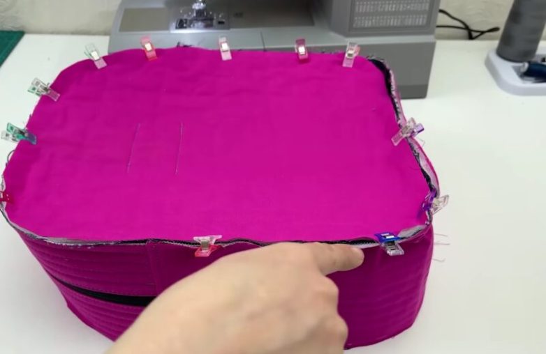 Приколите боковую часть рюкзака по периметру передней стенки. Зафиксируйте боковые стенки машинной строчкой, края окантуйте косой бейкой. Вшейте заднюю стенку рюкзака.
