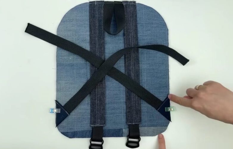 От плотной репсовой ленты отрежьте 2 заготовки длиной по 10 см. Сложите ленту пополам, вставьте ее в фиксаторы и закрепите внутри заготовок для лямок рюкзака. Проложите фиксирующую строчку по периметру лямок. Для дополнительной фиксации проложите две дополнительные строчки по центру лямок.