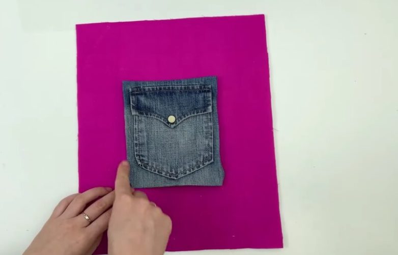 Отрежьте карман от старых джинсов, припуски заверните на изнаночную сторону и заутюжьте. Пришейте карман к внутренней части задней стенки будущего рюкзака.